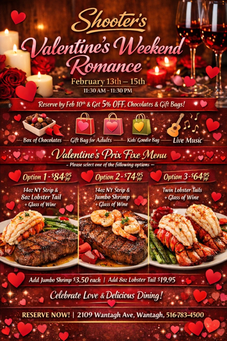 Join us on Valentine's Day for the perfect romantic evening! All Reservations made by February 10th get a 5% discount and a box of Valentine's Day chocolates to take home!!